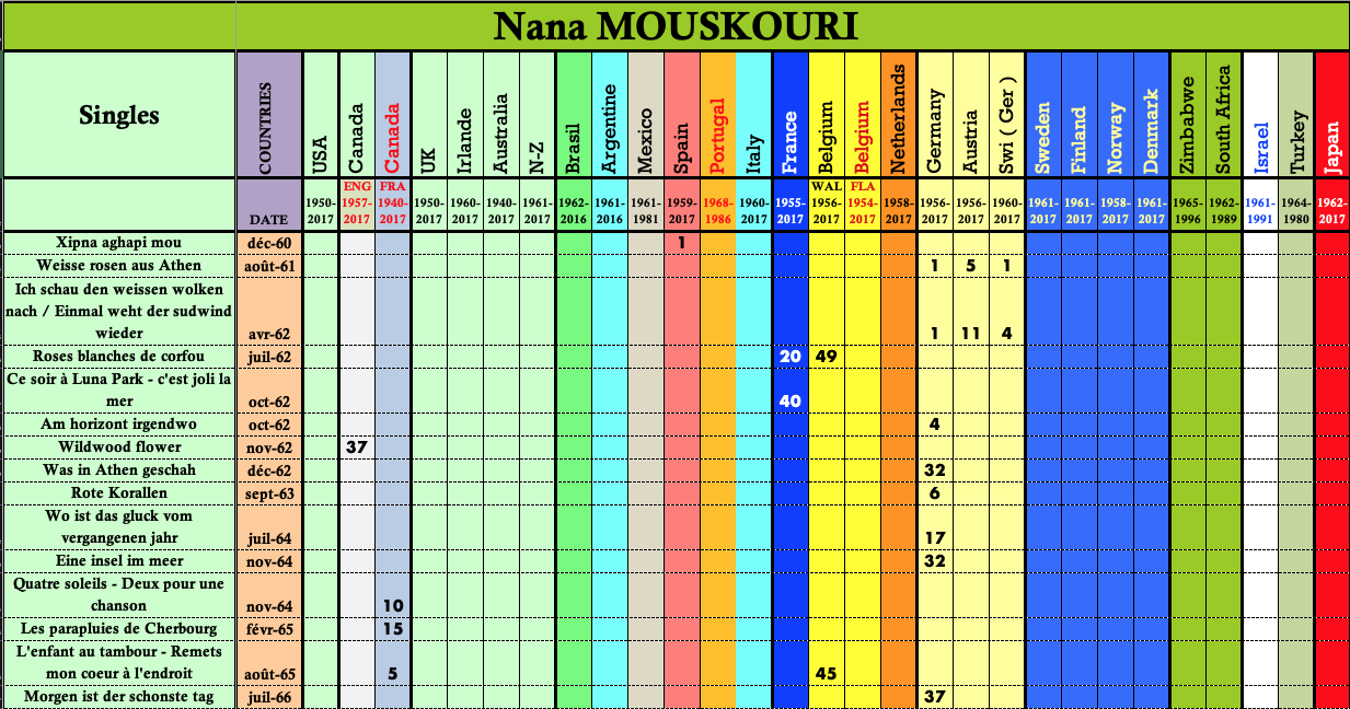RépondreSupprimerSauf que Nana Mouskouri n'a jamais eu de disque d 'or aux USA à peine 2 albums classés entre 100 et 200è.......et que Nana n'est pas du tout une vendeuse de singles.......rien au Japon , rien en Italie ....et les pays ou on vend 100 000 albums ne sont pas nombreux ......donc c'est vraiment de la foutaise, surtout que son plus gros marché c'est de loin la France ou elle a du vendre 15 millions de disques tous supports confondus......on se demande ou a t-elle vendu le reste , même si il y a quelques albums or en Allemagne et surtout Canada......on est très loin du compte ....